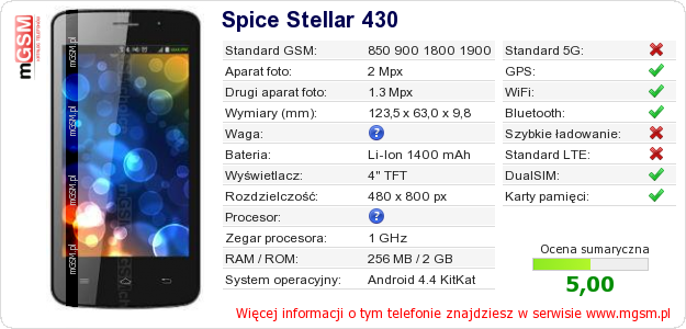 Dane telefonu Spice Stellar 430 na Twojej stronie
