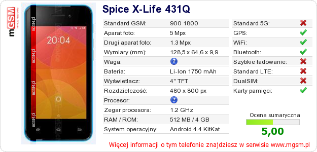 Dane telefonu Spice X-Life 431Q na Twojej stronie
