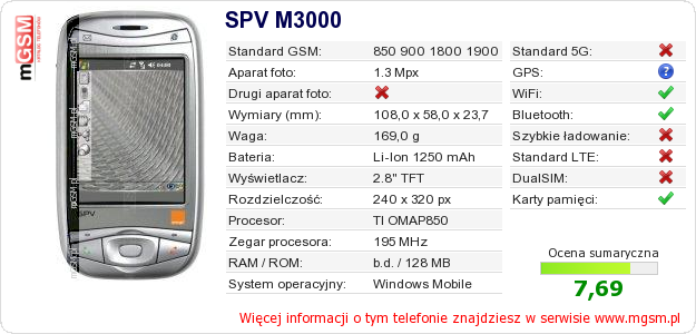 Dane telefonu SPV M3000 na Twojej stronie