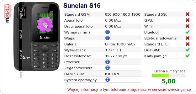 Dane telefonu Sunelan S16 na Twojej stronie