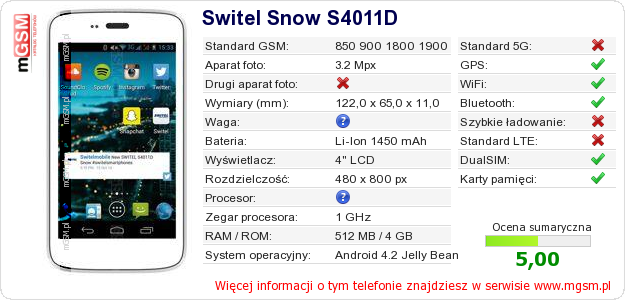 Dane telefonu Switel Snow S4011D na Twojej stronie