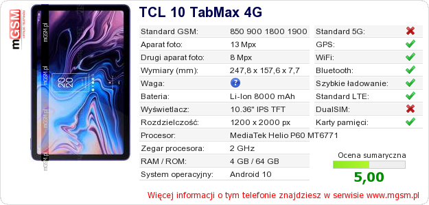 Dane telefonu TCL 10 TabMax 4G na Twojej stronie