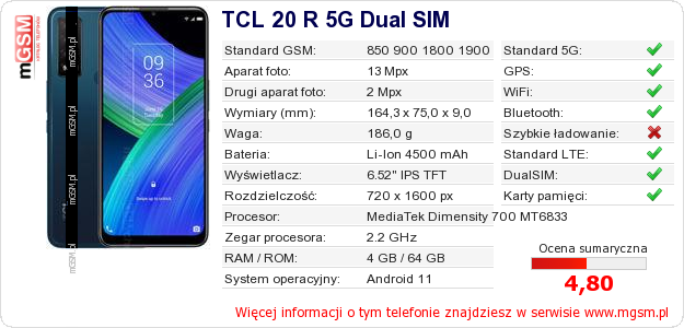 Dane telefonu TCL 20 R 5G Dual SIM na Twojej stronie