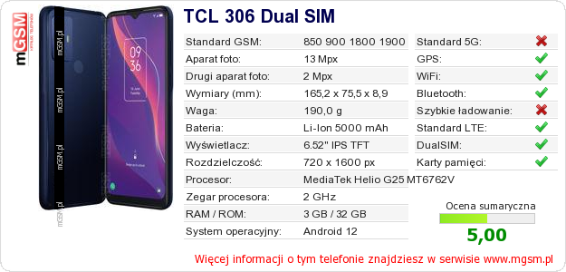 Dane telefonu TCL 306 Dual SIM na Twojej stronie
