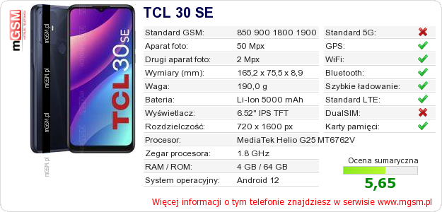 Dane telefonu TCL 30 SE na Twojej stronie