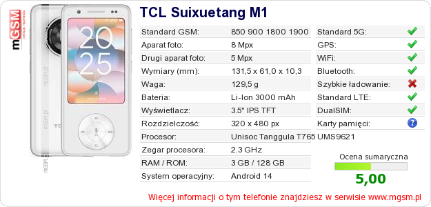 Dane telefonu TCL Suixuetang M1 na Twojej stronie