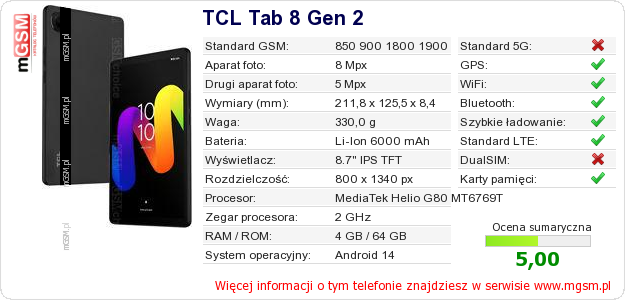 Dane telefonu TCL Tab 8 Gen 2 na Twojej stronie