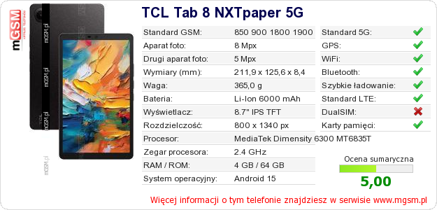 Dane telefonu TCL Tab 8 NXTpaper 5G na Twojej stronie