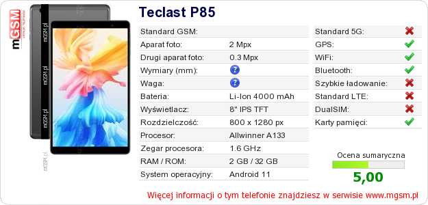 Dane telefonu Teclast P85 na Twojej stronie