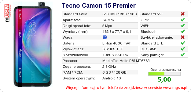 Dane telefonu Tecno Camon 15 Premier na Twojej stronie
