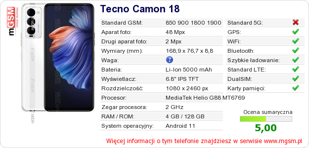 Dane telefonu Tecno Camon 18 na Twojej stronie