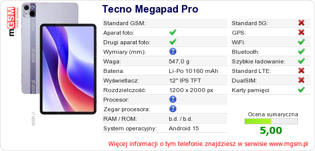 Dane telefonu Tecno Megapad Pro na Twojej stronie