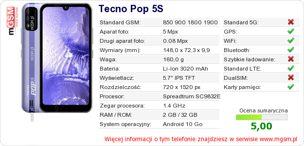 Dane telefonu Tecno Pop 5S na Twojej stronie