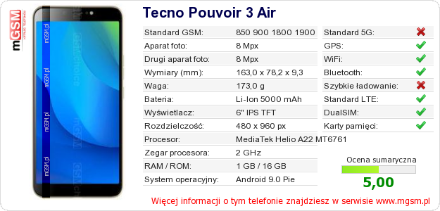 Dane telefonu Tecno Pouvoir 3 Air na Twojej stronie