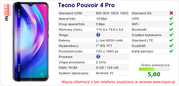 Dane telefonu Tecno Pouvoir 4 Pro na Twojej stronie