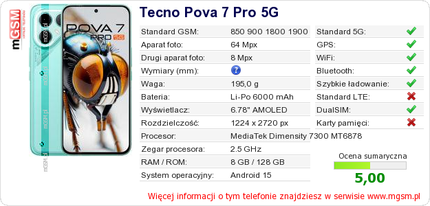 Masz swoją stronę? Chcesz wstawić gdzieś informacje o podstawowych danych telefonu Tecno Pova 7 Pro 5G ? To bardzo proste. Możesz pobrać obrazek, lub skopiować i wkleić na stronę poniższy kod:Wklejenie tego kodu spowoduje wyświetlenie poniższego obrazka: