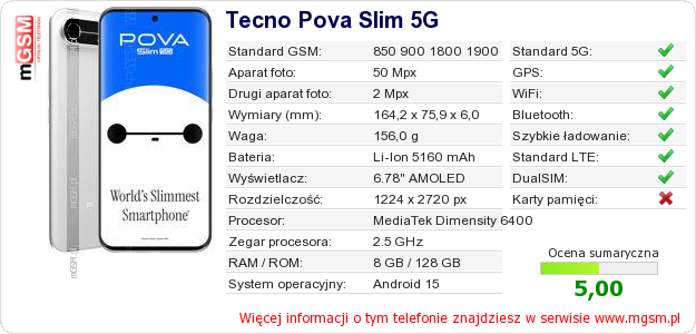 Dane telefonu Tecno Pova Slim 5G na Twojej stronie