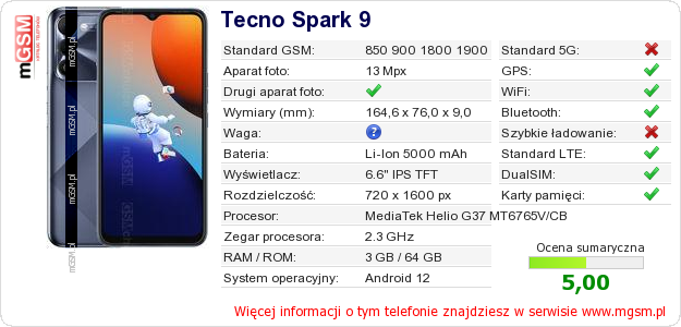 Dane telefonu Tecno Spark 9 na Twojej stronie