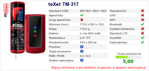 Dane telefonu teXet TM-317 na Twojej stronie