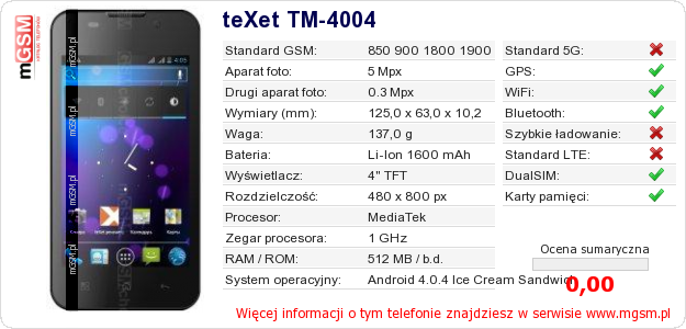 Dane telefonu teXet TM-4004 na Twojej stronie