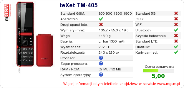 Dane telefonu teXet TM-405 na Twojej stronie