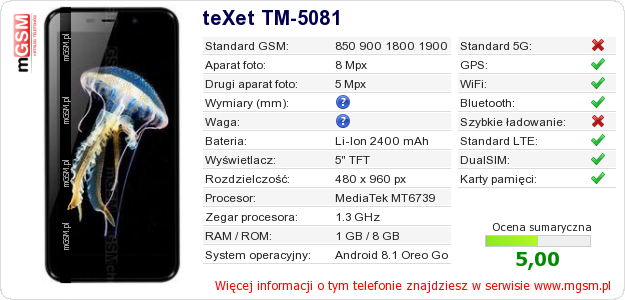 Dane telefonu teXet TM-5081 na Twojej stronie