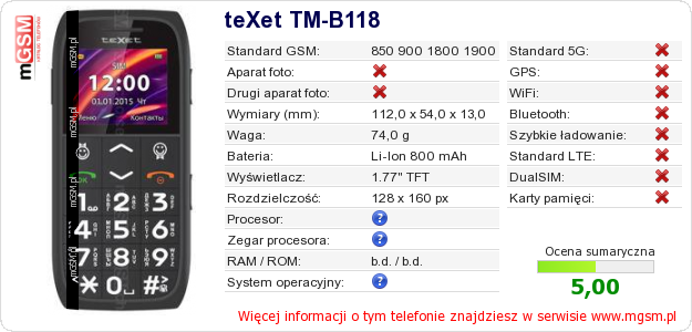 Dane telefonu teXet TM-B118 na Twojej stronie