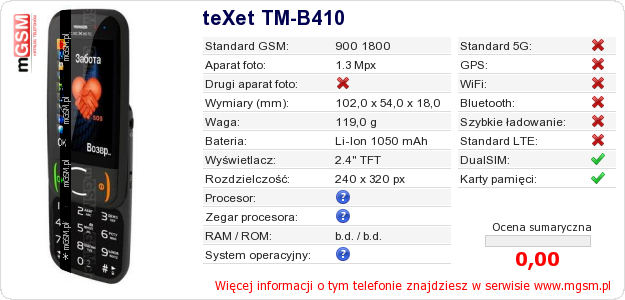 Dane telefonu teXet TM-B410 na Twojej stronie