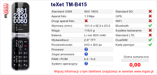 Dane telefonu teXet TM-B415 na Twojej stronie