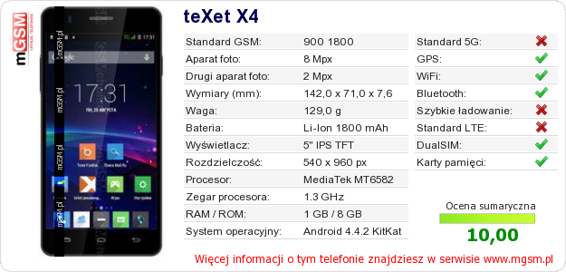 Dane telefonu teXet X4 na Twojej stronie