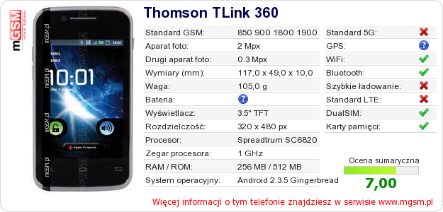 Dane telefonu Thomson TLink 360 na Twojej stronie