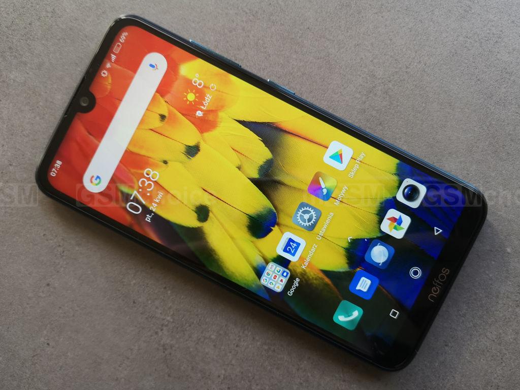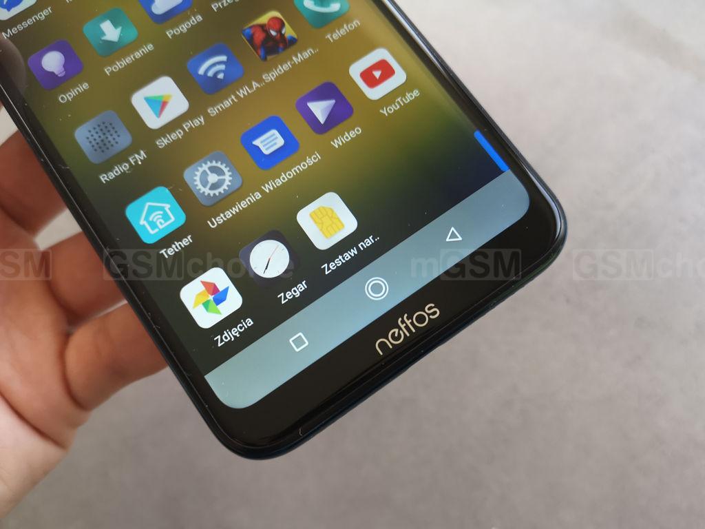 Ekran ma 6,26-calowy wyświetlacz typu FullView z charakterystycznym wcięciem w kształcie łezki. Ma wydłużone proporcje i przekątną 6,26 cala. Przy rozdzielczości 1520x720 pikseli daje to upakowanie pikseli na cal na poziomie 269 ppi - to poniżej wartości, przy której ludzkie oko jest w stanie rozróżnić pojedyncze piksele, ale jak na najniższą półkę cenową - nie ma co się czepiać. Sam ekran jest przeciętny - dość ciemny (praktycznie przez większość czasu używałam go przy najwyższej jasności, a w pełnym słońcu i tak nic nie widać), umiarkowanie szczegółowy (co wynika z wielkości i rozdzielczości), o dobrych, choć nieco zimnych kolorach. Szkoda, że interfejs nie pozwala na modyfikację wyświetlanych kolorów - można co najwyżej skorzystać z trybu ochrony oka (to po prostu filtr światła niebieskiego). Kąty widzenia są dobre, a telefon bez problemu można obsługiwać w okularach z polaryzacją - ekran nieco ciemnieje w poziomej orientacji, ale nie na tyle, by utrudniało to korzystanie z Neffosa. W górnej części ma półokrągły notch, w którym umieszczono frontowy aparat. Na górnej ramce znalazło się też miejsce na diodę powiadomień i głośnik rozmów.