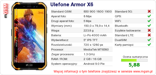 Dane telefonu Ulefone Armor X6 na Twojej stronie