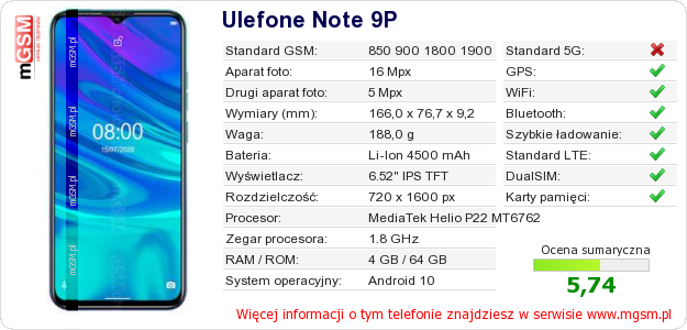 Dane telefonu Ulefone Note 9P na Twojej stronie