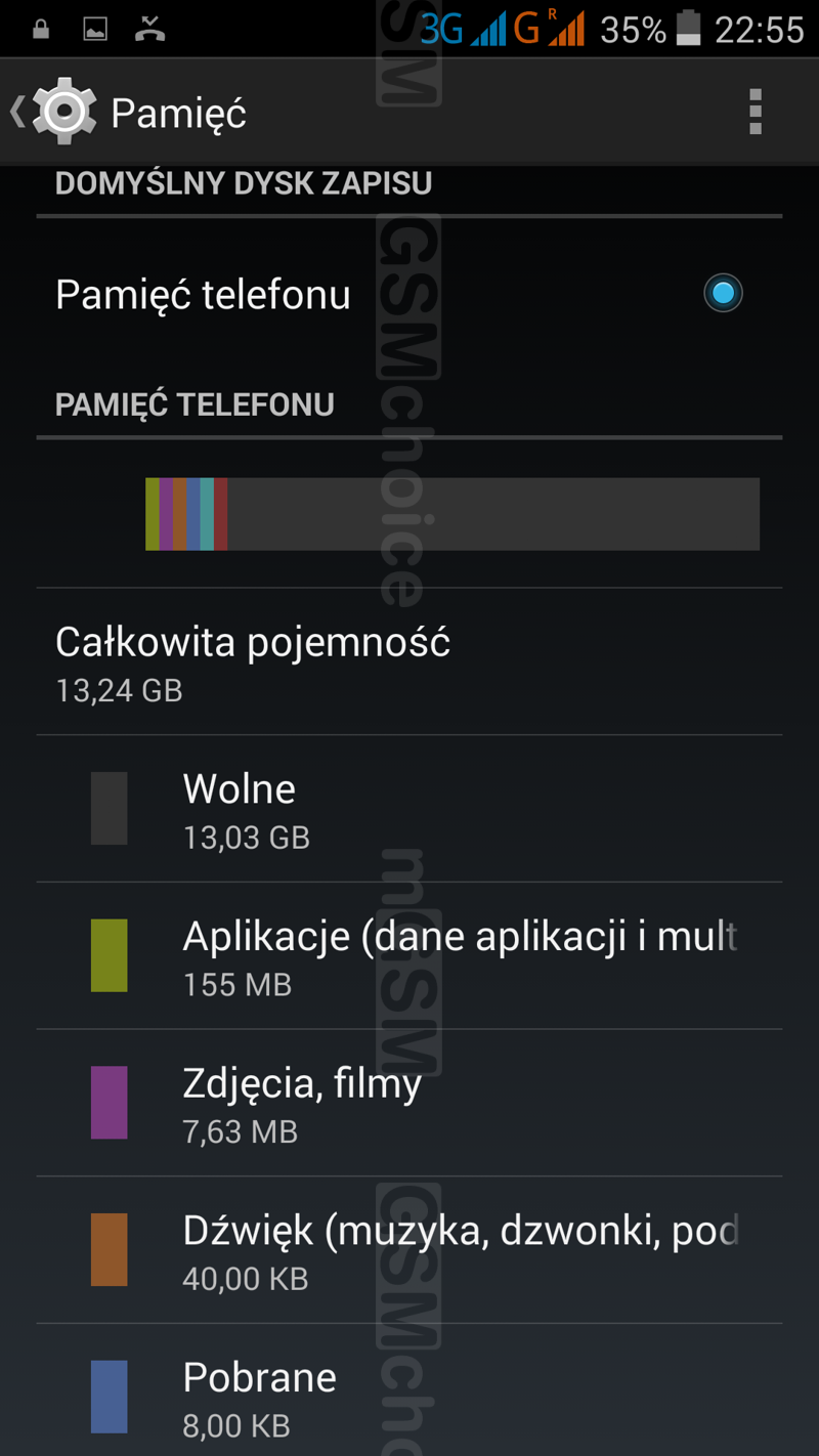 Smartfon wyposażony jest w 16GB wbudowanej pamięci, z czego dla użytkownika dostępnych jest ok. 13GB. Opcjonalnie, rezygnując z dual-SIM-a, można zamontować w jednym ze slotów kartę microSD. Obsługiwane są nośniki do 64GB.