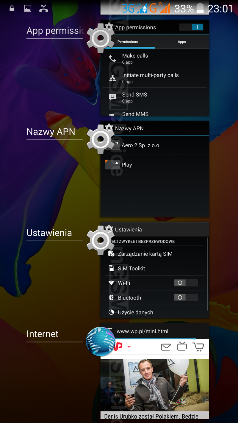 Smartfon ma pakiet podstawowych modułów do łączności: jest tu Wi-Fi z hotspotem, Bluetooth w wersji 4.0, port microUSB, uniwersalne gniazdo słuchawkowe, obsługa sieci 2G i 3G oraz GPS z aGPS. Na dodatek smartfon może obsługiwać dwie karty SIM (albo jedną kartę SIM oraz kartę pamięci). Bez problemu działa z Aero2. Trzeba zaznaczyć, że w układzie dual-SIM tylko jeden slot obsługuje sieci 3G - kartę SIM, która ma obsługiwać częstotliwości WCDMA, przyporządkowuje się z poziomu menu ustawień.
