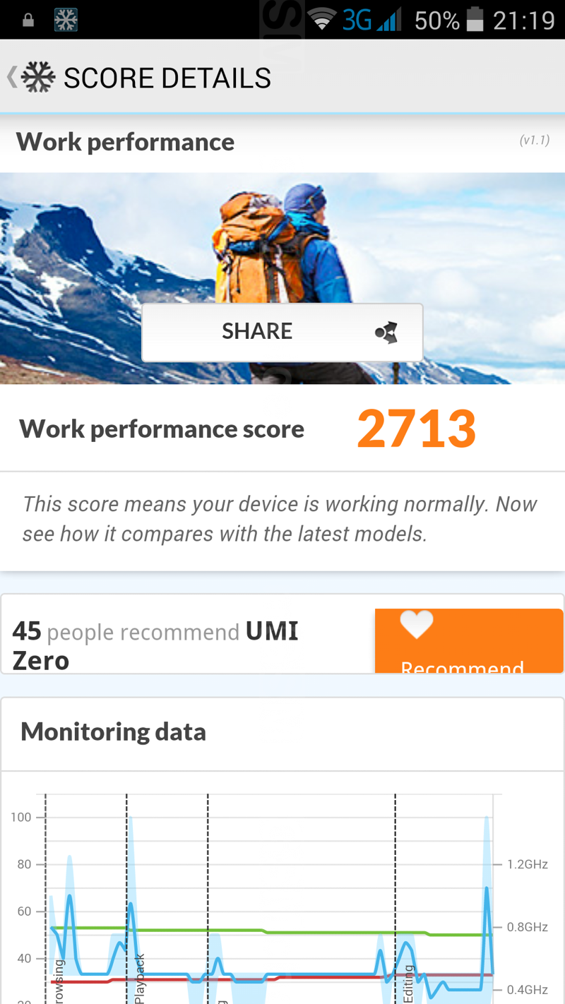 Pod względem wydajności UMi Zero nie rozczaruje. Ma wydajny, 8-rdzeniowy procesor MT6592T o taktowaniu 2GHz, 2 GB pamięci RAM i układ graficzny Mali-450 MP. Na tej konfiguracji płynnie działa i interfejs, i aplikacje, i nawet bardziej zasobożerne gry (sprawdzone m.in. na Real Racing 3). Obciążone podzespoły intensywnie oddają ciepło, co jest wyraźnie odczuwalne zwłaszcza w górnej części tylnego panelu.