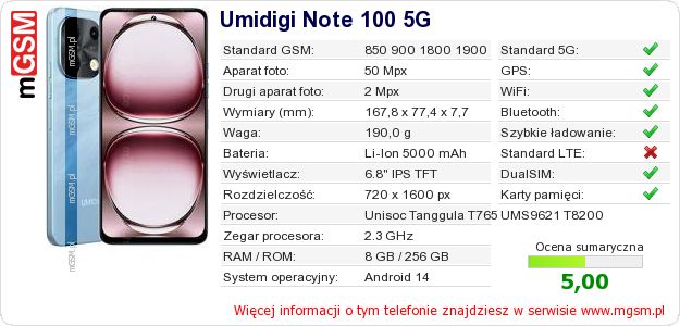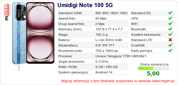 Dane telefonu Umidigi Note 100 5G na Twojej stronie