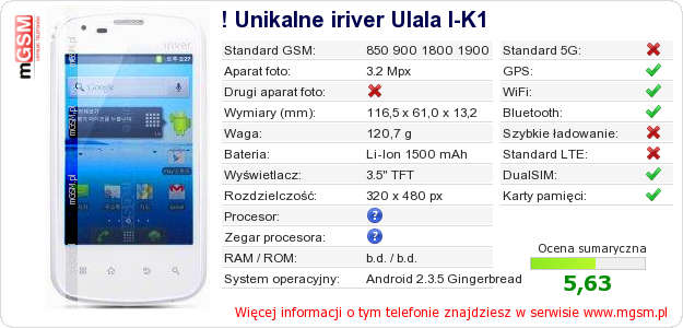 Dane telefonu ! Unikalne iriver Ulala I-K1 na Twojej stronie