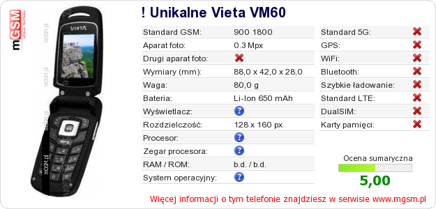 Dane telefonu ! Unikalne Vieta VM60 na Twojej stronie
