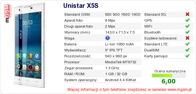 Dane telefonu Unistar X5S na Twojej stronie