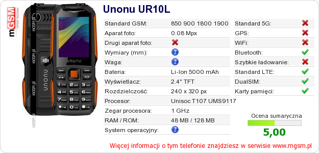Dane telefonu Unonu UR10L na Twojej stronie