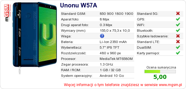 Dane telefonu Unonu W57A na Twojej stronie