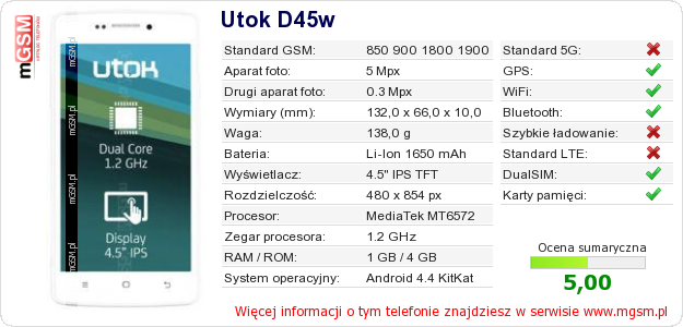 Dane telefonu Utok D45w na Twojej stronie