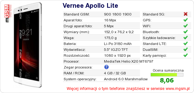 Dane telefonu Vernee Apollo Lite na Twojej stronie