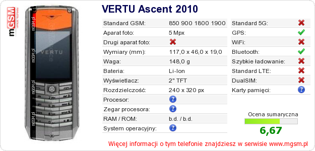 Dane telefonu VERTU Ascent 2010 na Twojej stronie