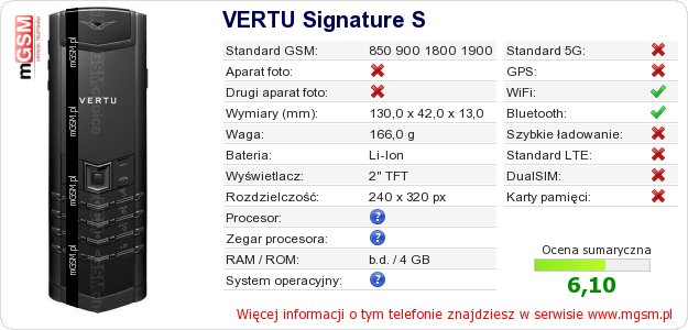 Masz swoją stronę? Chcesz wstawić gdzieś informacje o podstawowych danych telefonu VERTU Signature S ? To bardzo proste. Możesz pobrać obrazek, lub skopiować i wkleić na stronę poniższy kod:Wklejenie tego kodu spowoduje wyświetlenie poniższego obrazka: