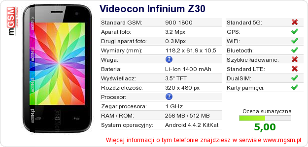 Dane telefonu Videocon Infinium Z30 na Twojej stronie