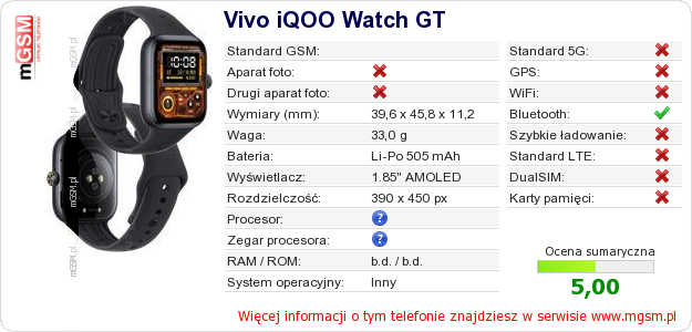 Dane telefonu Vivo iQOO Watch GT na Twojej stronie