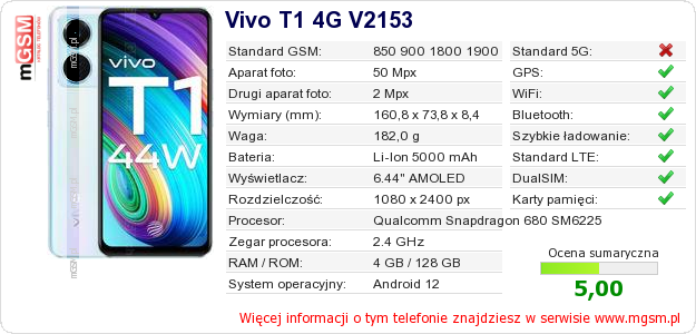 Dane telefonu Vivo T1 4G V2153 na Twojej stronie